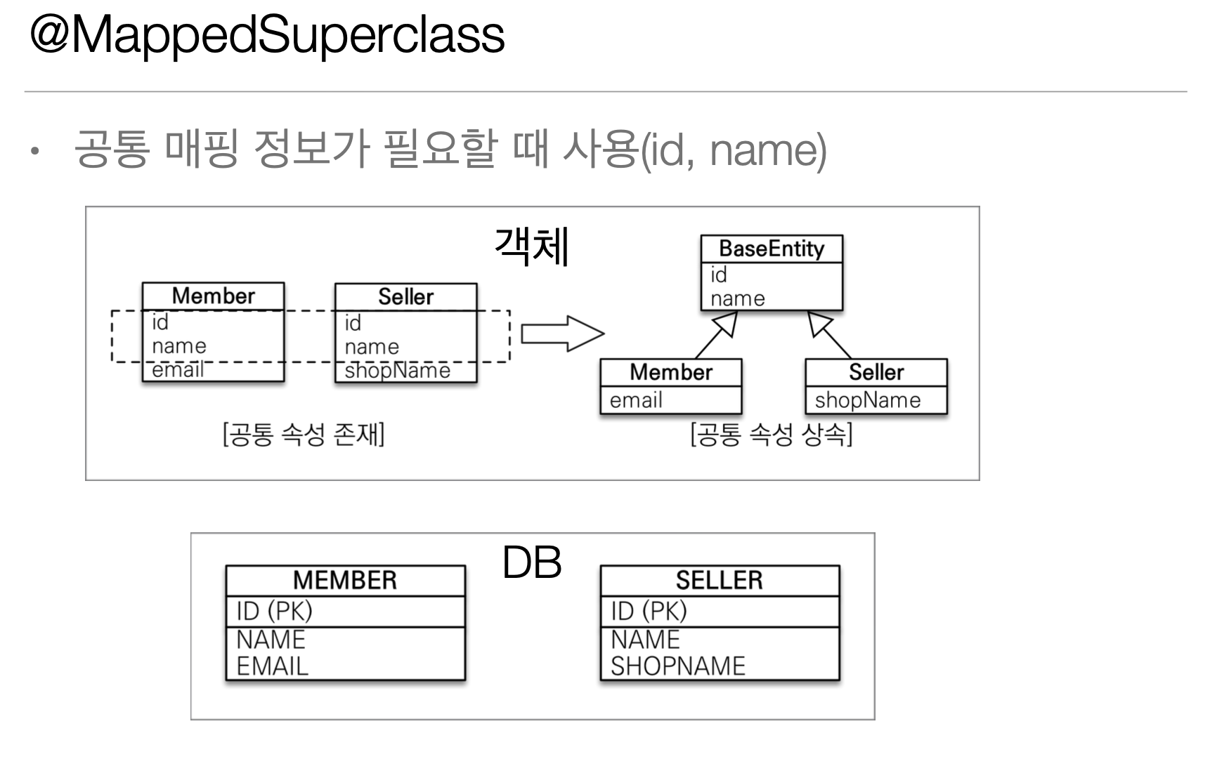 테이블과 관계가 없고, 단순히 엔티티가 공통으로 서용하는 매핑 정보를 모으는 역할을 한다.