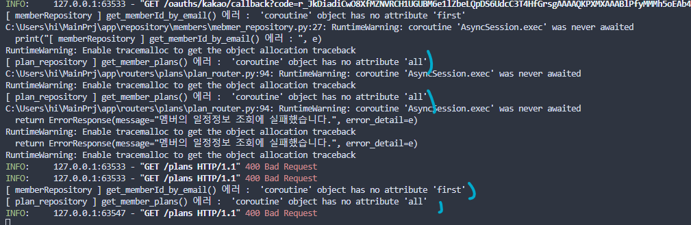 Db를 붙여보니 실제로 비동기로 동작하는것 같다. 다만 지금 함수들이 전부 def로 되어있어서 코루틴을 처리 못하고 있다.