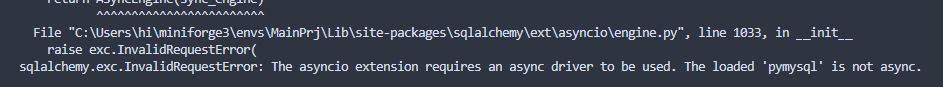 pymysql은 비동기 드라이버가 아니라고 친절하게도 알려주고 있다.