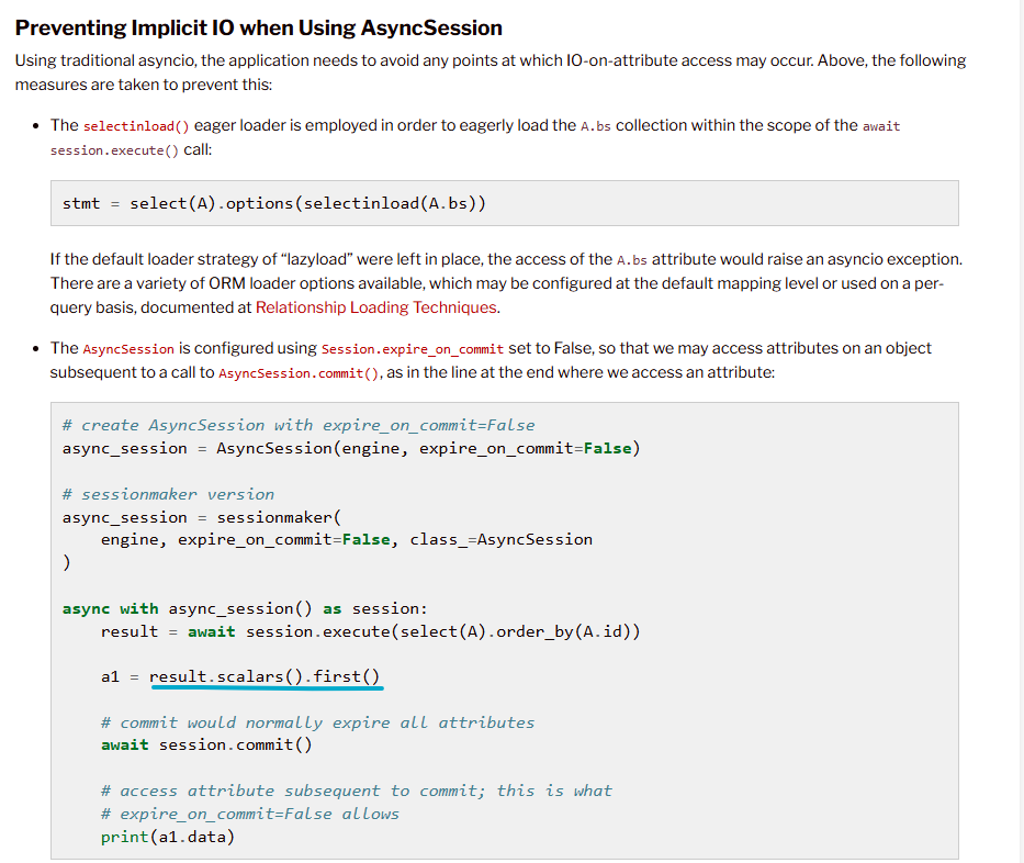 AsyncSessionclass provides full ORM functionality. Within the default mode of use, special care must be taken to avoid lazy loading or other expired-attribute access involving ORM relationships and column attributes; the next section Preventing Implicit IO when Using AsyncSession details this. The example below illustrates a complete example including mapper and session configuration: