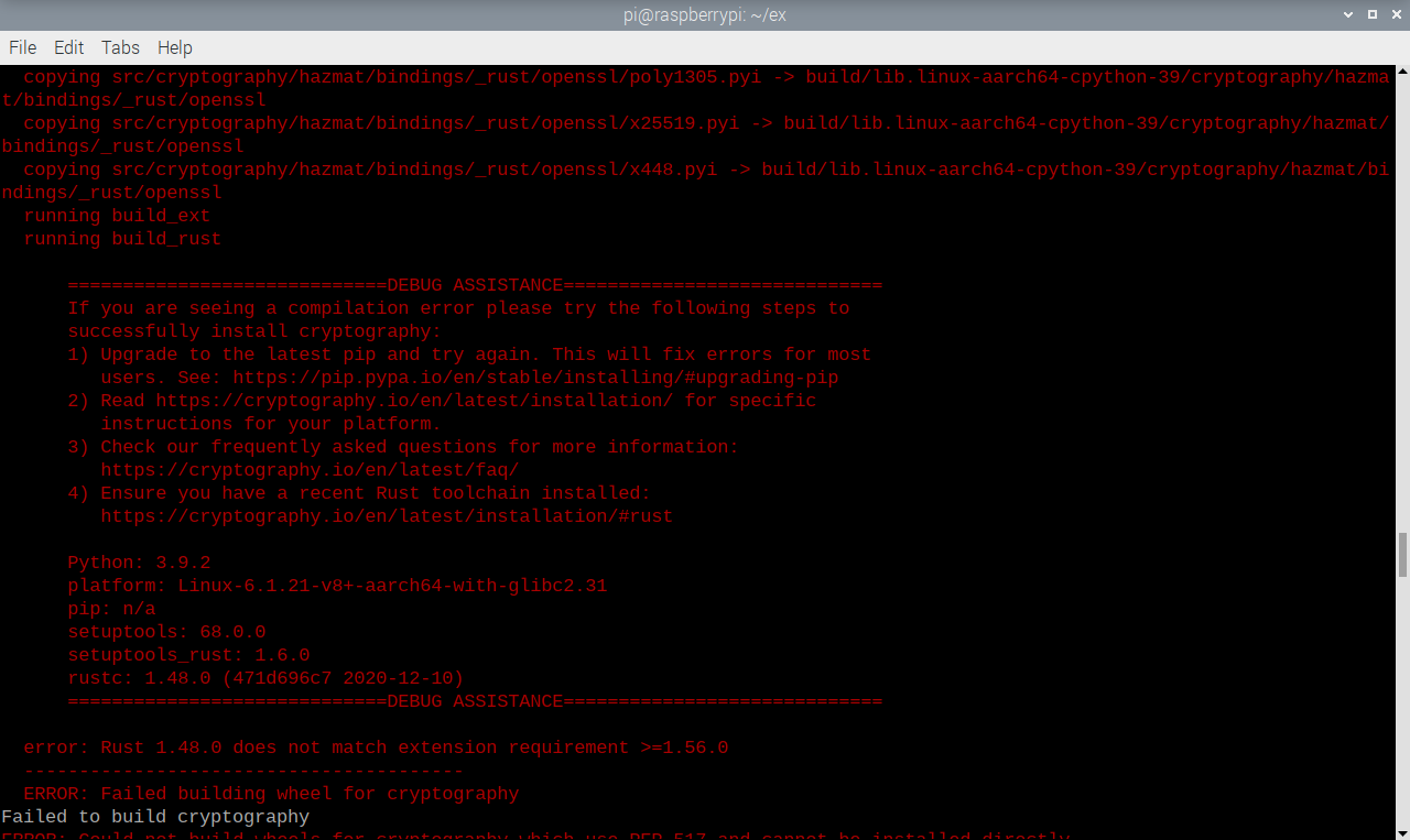자세히 살펴보면 cryptography라는 것을 빌드하는 것에 실패했다며, rustc 컴파일러를 1.48.0에서 1.56.0 이상으로 버전업하라고 권하고 있다.