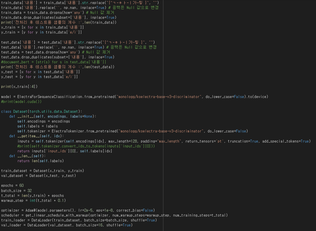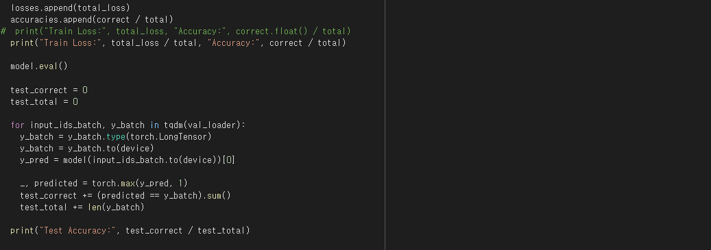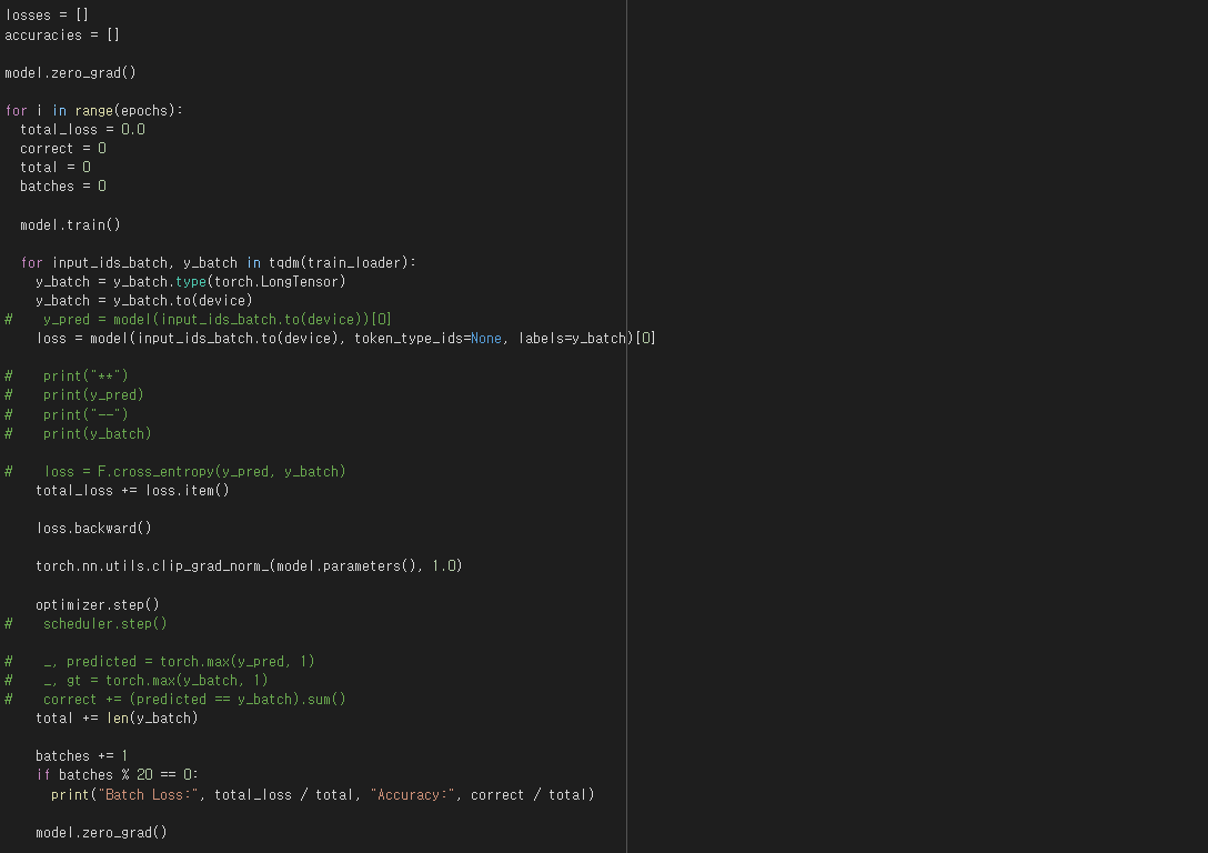 아쉽게도 BERT 모델 역시 완전한 모델로 구현하기에는 실패하였지만, 프로젝트를 위하여 다양한 알고리즘을 접해보고 구현하려고 시도한 것만으로도 많은 것을 배우는 등 충분한 의의가 있었다고 생각한다. 이 또한 프로젝트가 마무리되고 나중에 개발에 성공하여, 개인적으로라도 세가지 알고리즘(MLP, BERT, 그리고 실제 프로젝트에서 사용되는 LSTM)의 성능을 각각 비교해보고 싶다.