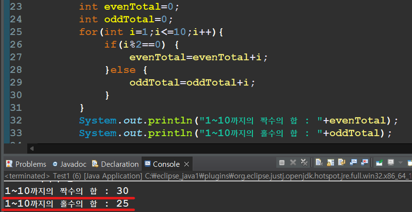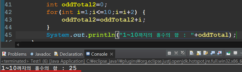 System.out.println("1~10까지의 홀수의 합 : "+oddTotal);