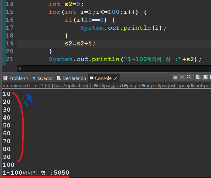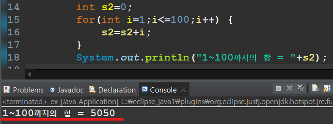 System.out.println("1~100까지의 합="+s2); // 1~100까지의 합 : 5050