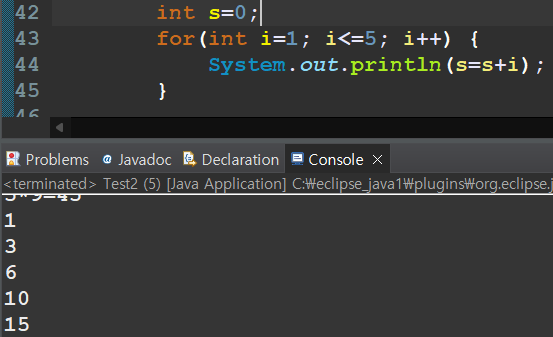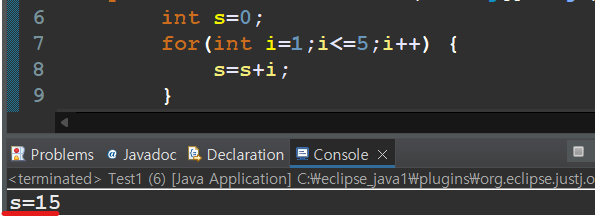 System.out.println("s="+s); // s=15