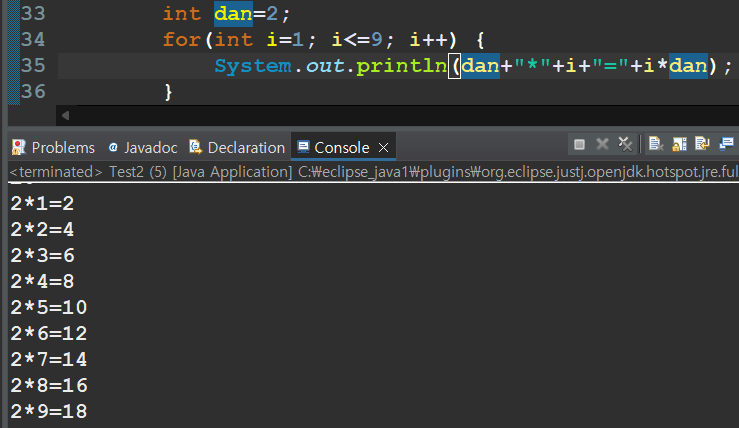 - int dan 변수 정의하고 2단 출력하기
