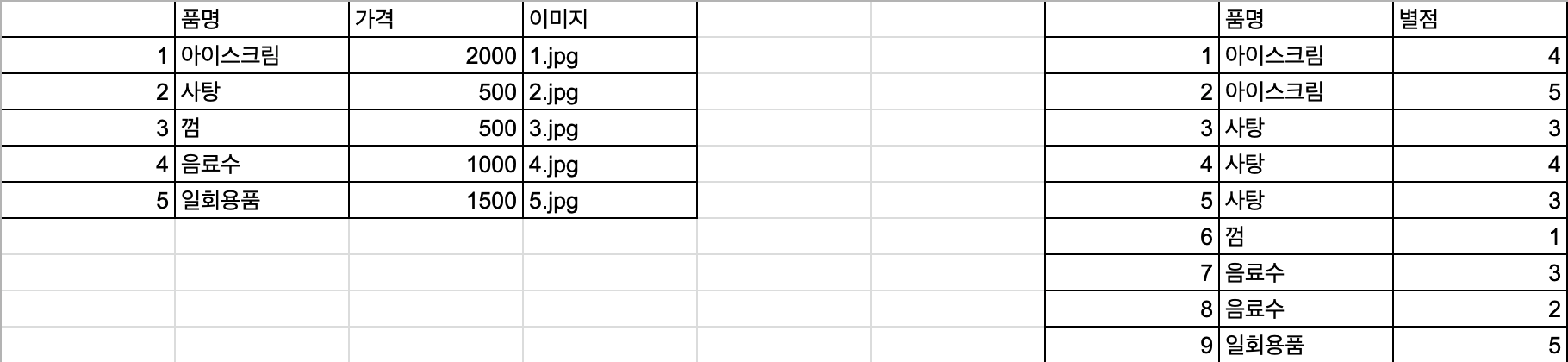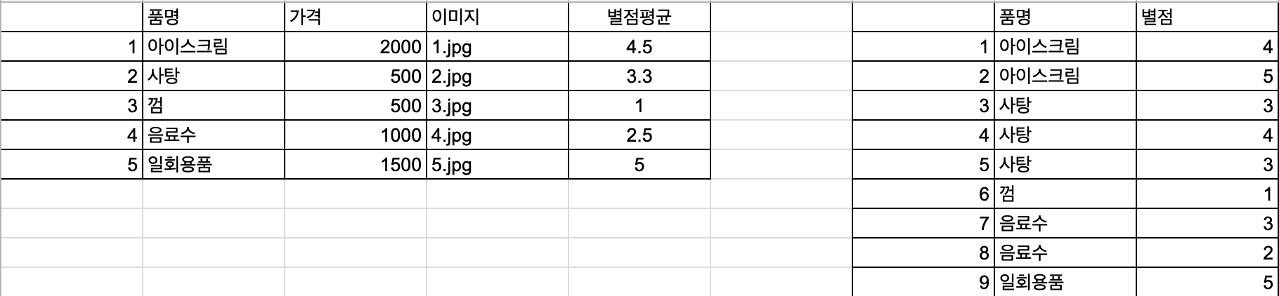 왼쪽부터 '제품', '별점'이라는 2개의 테이블이 있다.