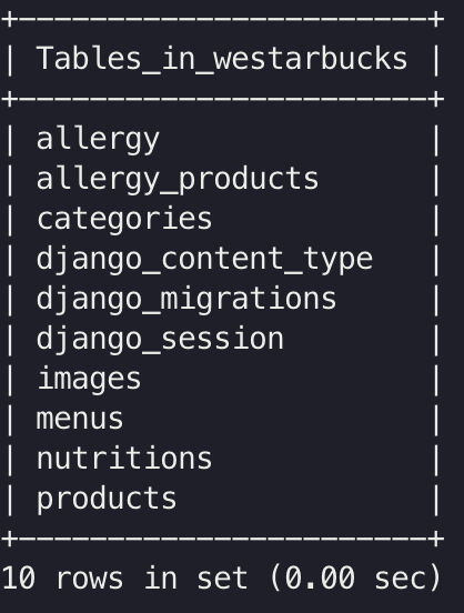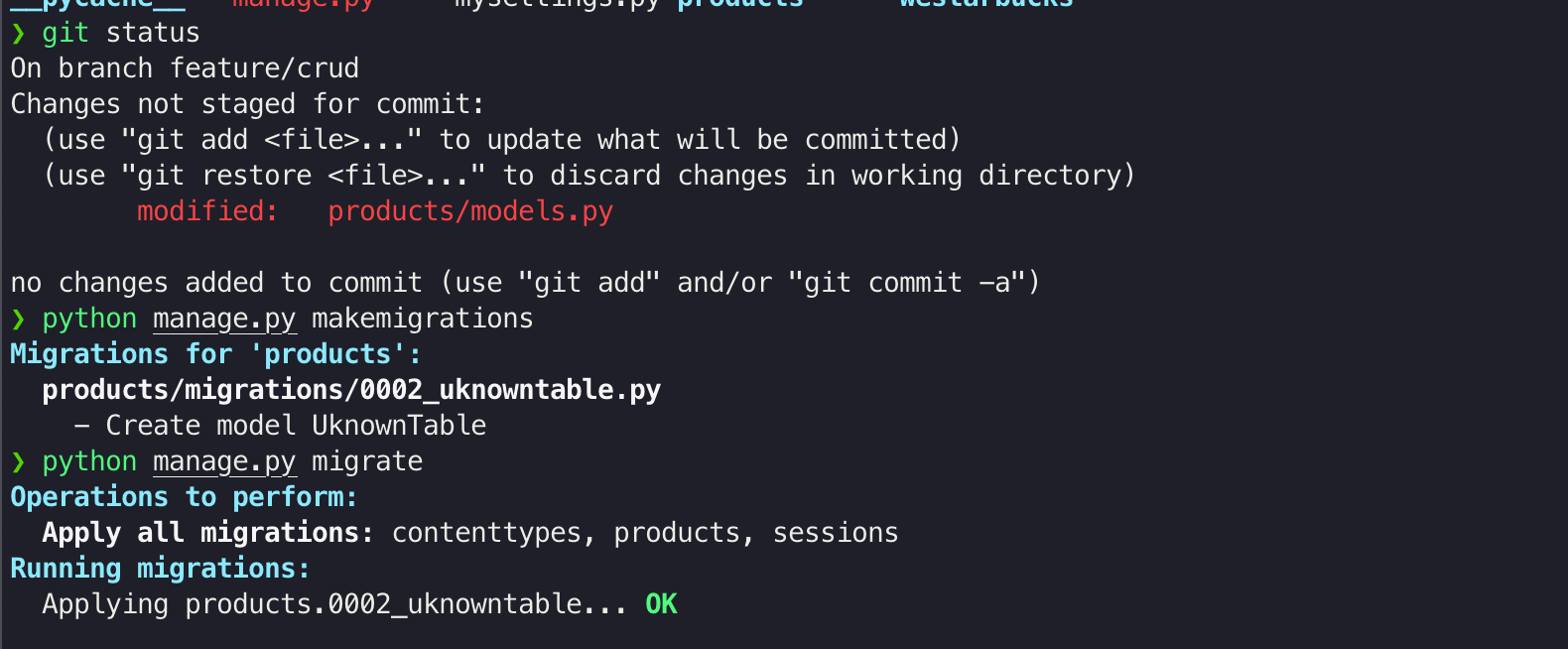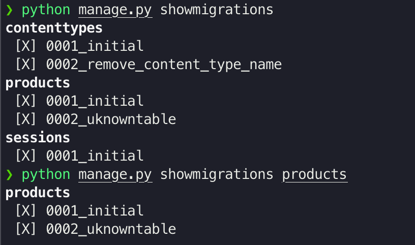 python manage.py showmigrations로 products앱의 0002번으로 uknowntable이란 파일이 생성된 것이 확인된다.