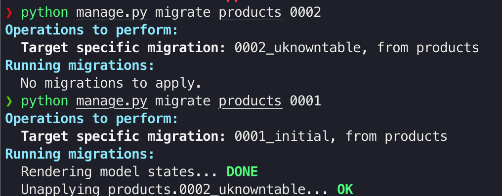 python manage.py makemigrations에는 여전히 변경사항이 없다고 나오고 그냥 python manage.py migrate해봐야 다시 원상태로 돌아가는 점위의 실습처럼 롤백을 한 뒤, 해당 migrations 파일을 지우면 된다. (위의 예에서는 products/migrations/0002_uknwontable.py 파일)