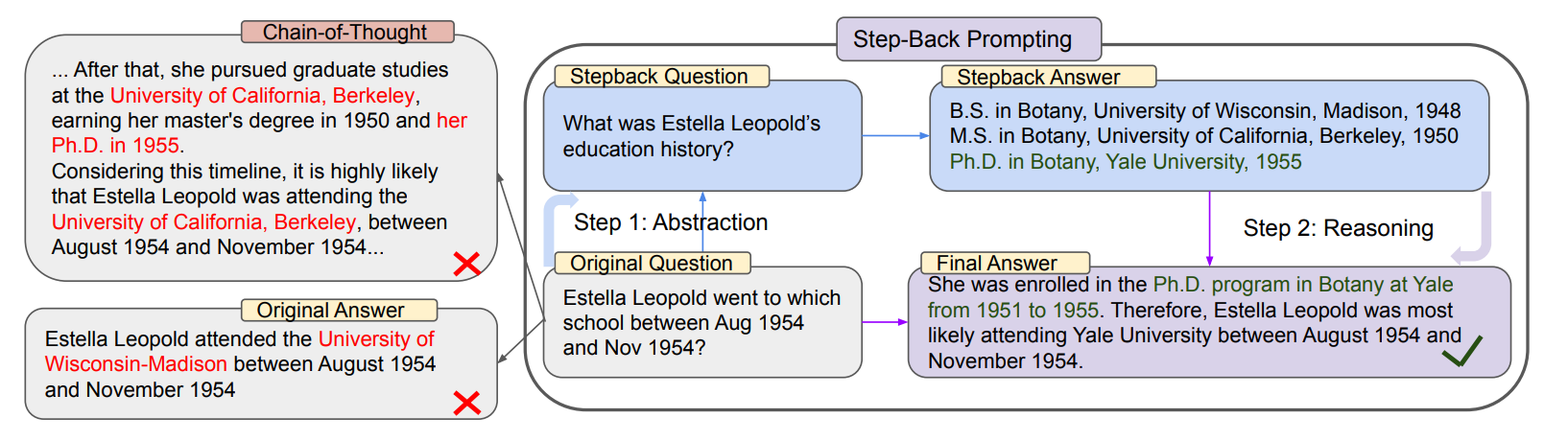 위 문제는 Estella Leopold가 1954년 8월 ~ 11월까지 어떤 학교에 다녔는지 뭍고 있습니다. 마찬가지로 이 문제를 바로 해결하려고 하면 LLM은 오류를 범하게 됩니다. 하지만 이 문제에 직접 들어가기전 그녀의 과거 교육 이력에 대해 점검하면 이를 통해 정답에 더 안정적으로 도달할 수 있게 됩니다.