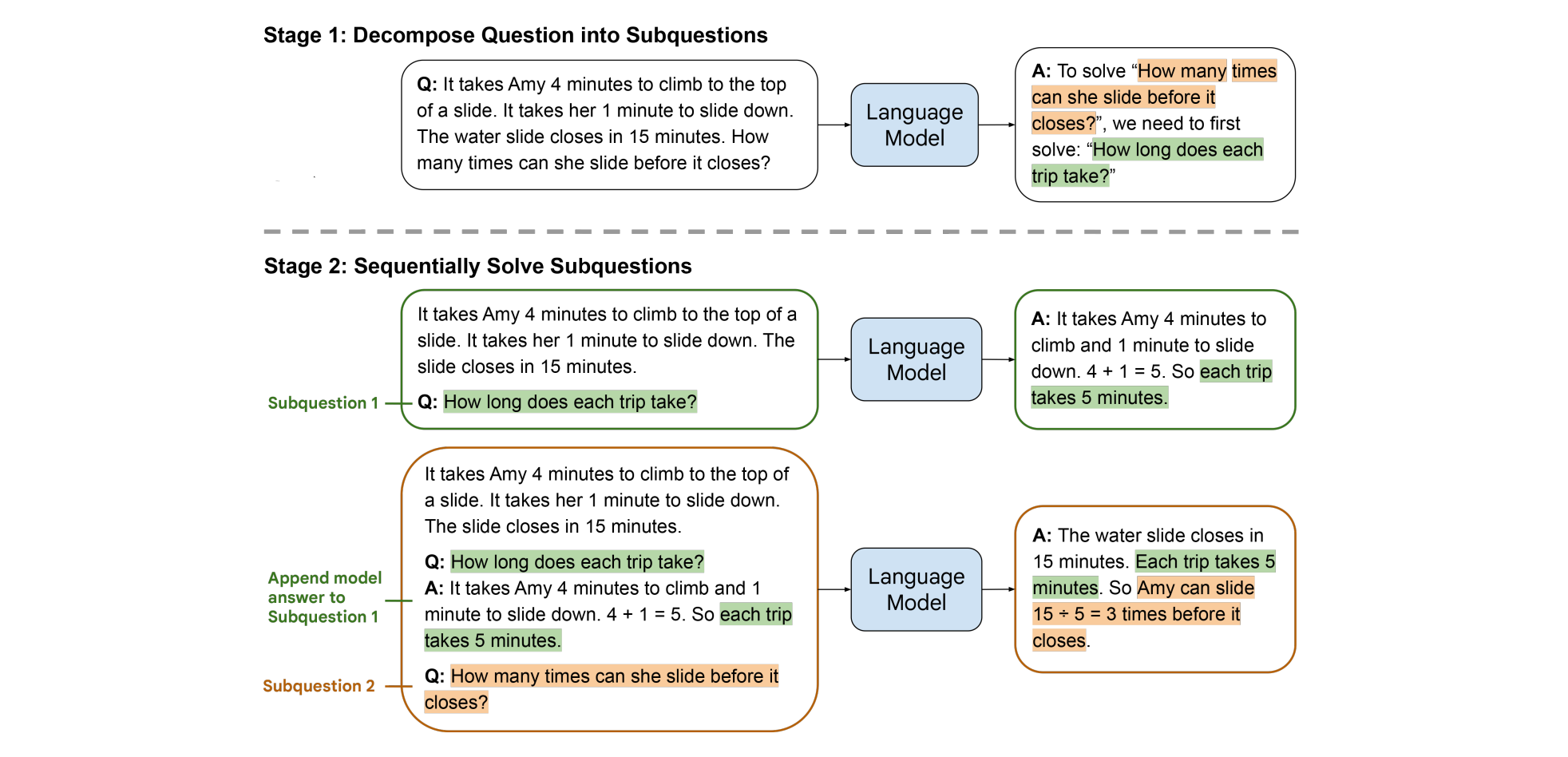 그 대신 LLM으로부터 먼저 이 문제를 하위 문제로 쪼개라고 하는 겁니다. 그렇게 되면 "한 번 타는데 얼마나 걸리는가?"라는 문제를 먼저 해결해야 함을 알 수 있습니다. 이 문제를 해결한 LLM은 하위 문제에 대한 Q-A 정보를 가지고 최종 질문에 대한 계산을 쉽게 할 수 있게 됩니다. 아래의 논문에서 소개하는 아래의 예시도 한 번 볼까요?