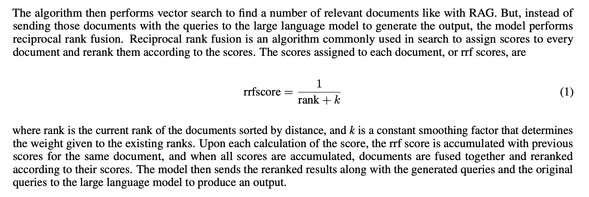 이 때 사용되는 대표적인 랭킹 프로세스는 RRF(Reciprocal Rank Fusion) 입니다. RRF는 여러 순위 목록을 결합하여 더 나은 통합 순위를 생성하는 알고리즘입니다. 이를 RAG와 결합하여 RAG-Fusion 이라는 이름이 탄생한 것이죠. 아래는 RAG-Fusion의 논문 [RAG-Fusion: a New Take on Retrieval-Augmented Generation] 내용입니다.