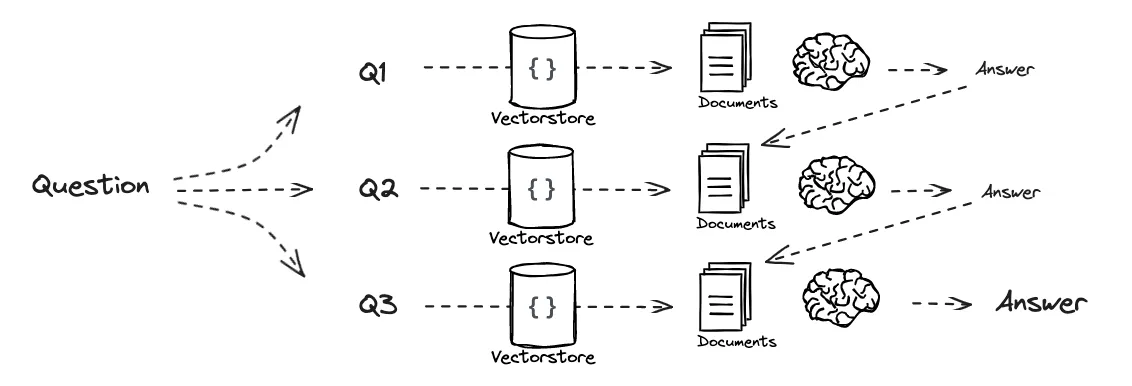 지금까지는 하나의 쿼리에 대해 여러 쿼리들로 다시 쓰는 기법이었습니다. 이와 달리, Decomposition 은 쿼리, 즉 질문을 여러 개의 하위 질문으로 쪼개는 기법입니다. 문제를 해결하기 위해 작고 쉬운 하위 질문으로 시작해 해결을 반복하며 최종 질문에 대한 결론까지 도달하는 것이죠.