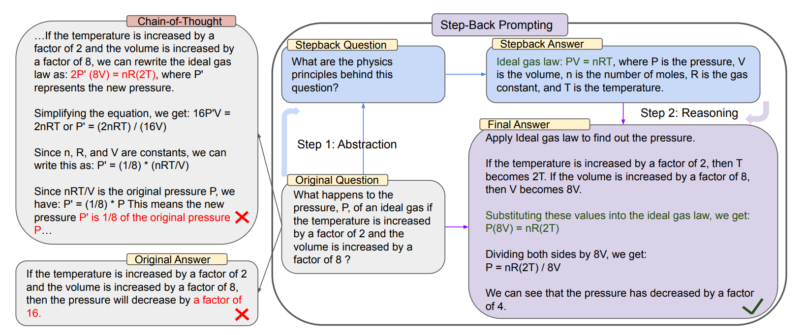 Step-Back Prompting 또한 구글에서 발표한 것으로, 앞선 Least-to-most 와는 반대로 더욱 추상적인 질문으로 바꾸는 방식입니다. 누군가 어떤 디테일에 대해서 묻는다면, 바로 그 문제에 돌입하는 것보다 조금 떨어져서 문제를 점검하는 것이 도움이 될 때가 있습니다. 아래는 해당 논문 [TAKE A STEP BACK: EVOKING REASONING VIA ABSTRACTION IN LARGE LANGUAGE MODELS] 에서 보여주는 예시입니다.