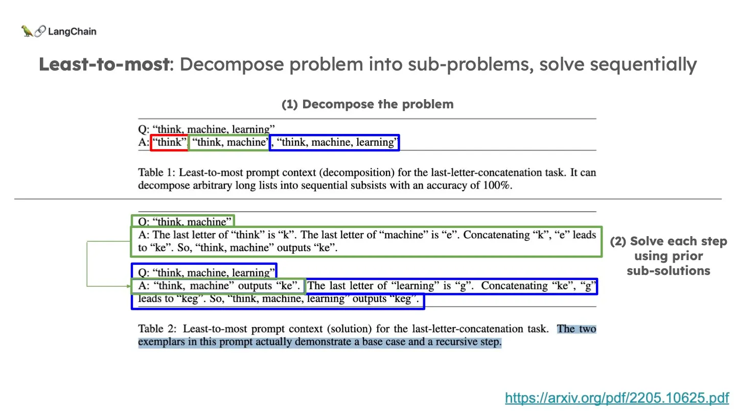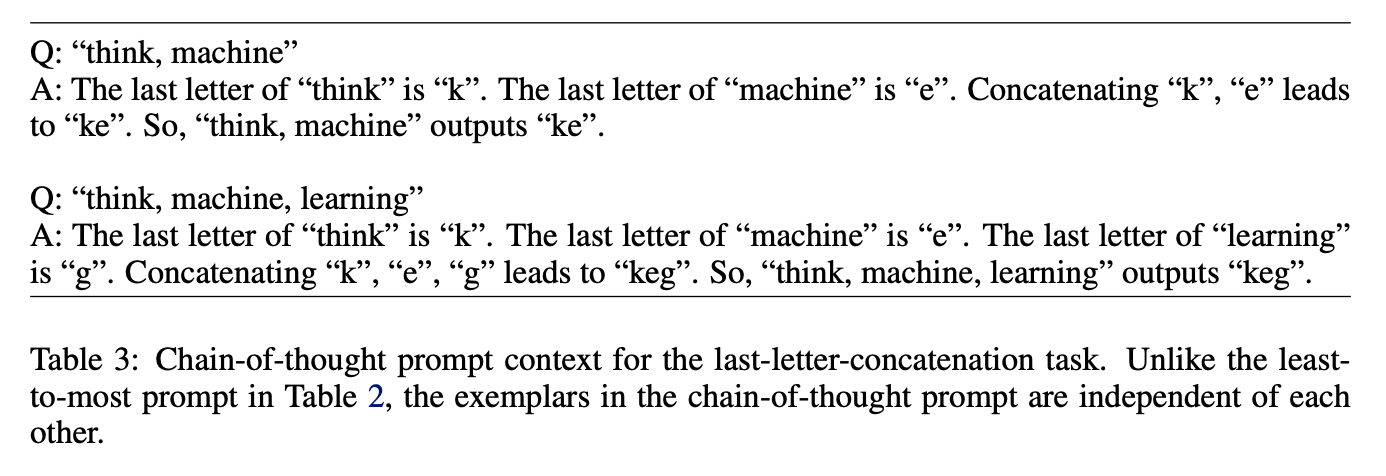 위 문제는 각 단어의 마지막 문자를 합친 결과를 요청하는 task입니다. "think, machine, learning" 문제를 "think", "think, machine", "think, machine, learning" 이라는 단계적 문제로 분해하는 context (예시) 를 decomposition 요청에 실어줍니다.