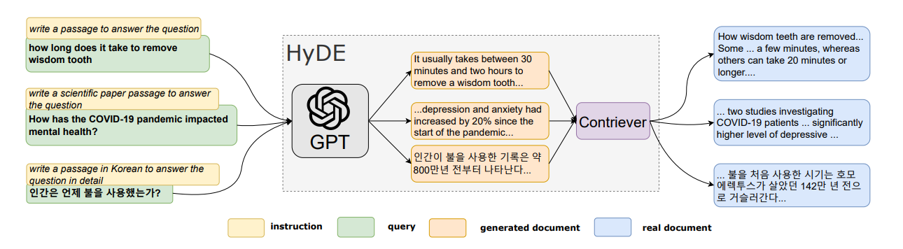 문서화 한다는 건 다른게 아니고 LLM에게 적절한 프롬프트로 질문에 대한 가상의 문서를 만들도록 하는 것입니다. 가상이기 때문에 정확하진 않겠지만, 그건 문제가 아닙니다. 그 가상의 문서를 실제로 context로 사용하는 게 아니라 그저 Retrieval 용도로만 쓰는 것이죠. 위 HyDE 논문 그림에서 한국어가 등장하여 반가운데요. "인간이 불은 언제 사용했는가?" 라는 질문에 그럴듯한 문서를 만드는 것입니다. 이것을 활용해서 Retrieval을 진행하면 아래 그림과 같이 기존 질문보다도 실제 필요한 문서에 더 Semantic 하게 가까운 문서를 찾아낼 수 있는 것이죠.