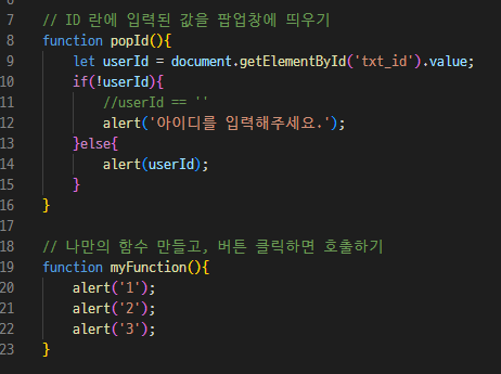 버튼을 클릭하면 아이디의 값이 화면에 출력되는 함수를 만들어보겠다.