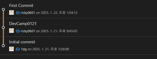 커밋 ID, 작성자, 날짜 등 다양한 정보가 출력된다.
