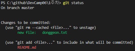용도: 현재 Git 저장소의 상태를 확인한다.