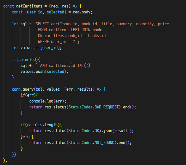 SQL의 IN() 을 사용해서 해당하는 장바구니만 조회되게끔 했다.
