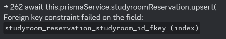 studyRoomReservation을 upsert 하는 과정에서 studyroom id를 외래키로 가져올 때 문제가 생겼다는 것을 알 수 있다.