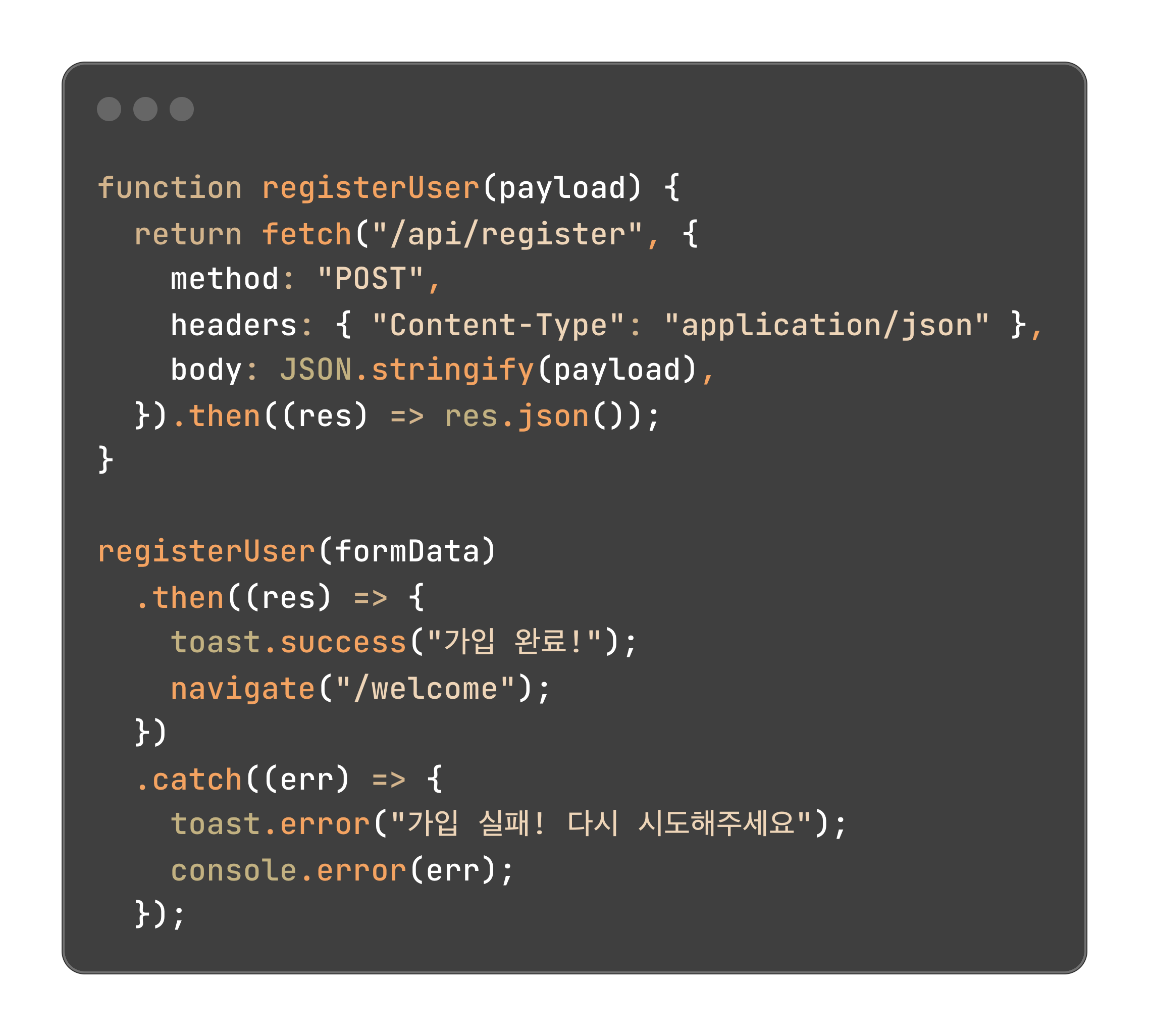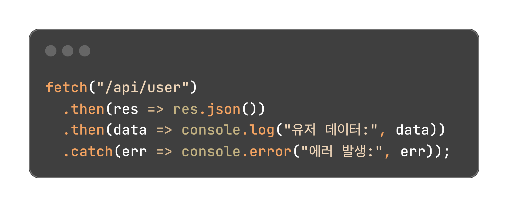 .then() 작업이 성공(fulfilled)했을 때 실행할 코드를 등록해요..catch() 작업이 실패(rejected)했을 때 실행할 코드를 등록해요..finally() 성공하든 실패하든 항상 마지막에 실행되는 코드를 등록해요.위 메서드들을 통해 서버 응답을 다룰 때도 복잡한 콜백 없이 단계별로 깔끔하게 코드 흐름을 작성할 수 있어요.