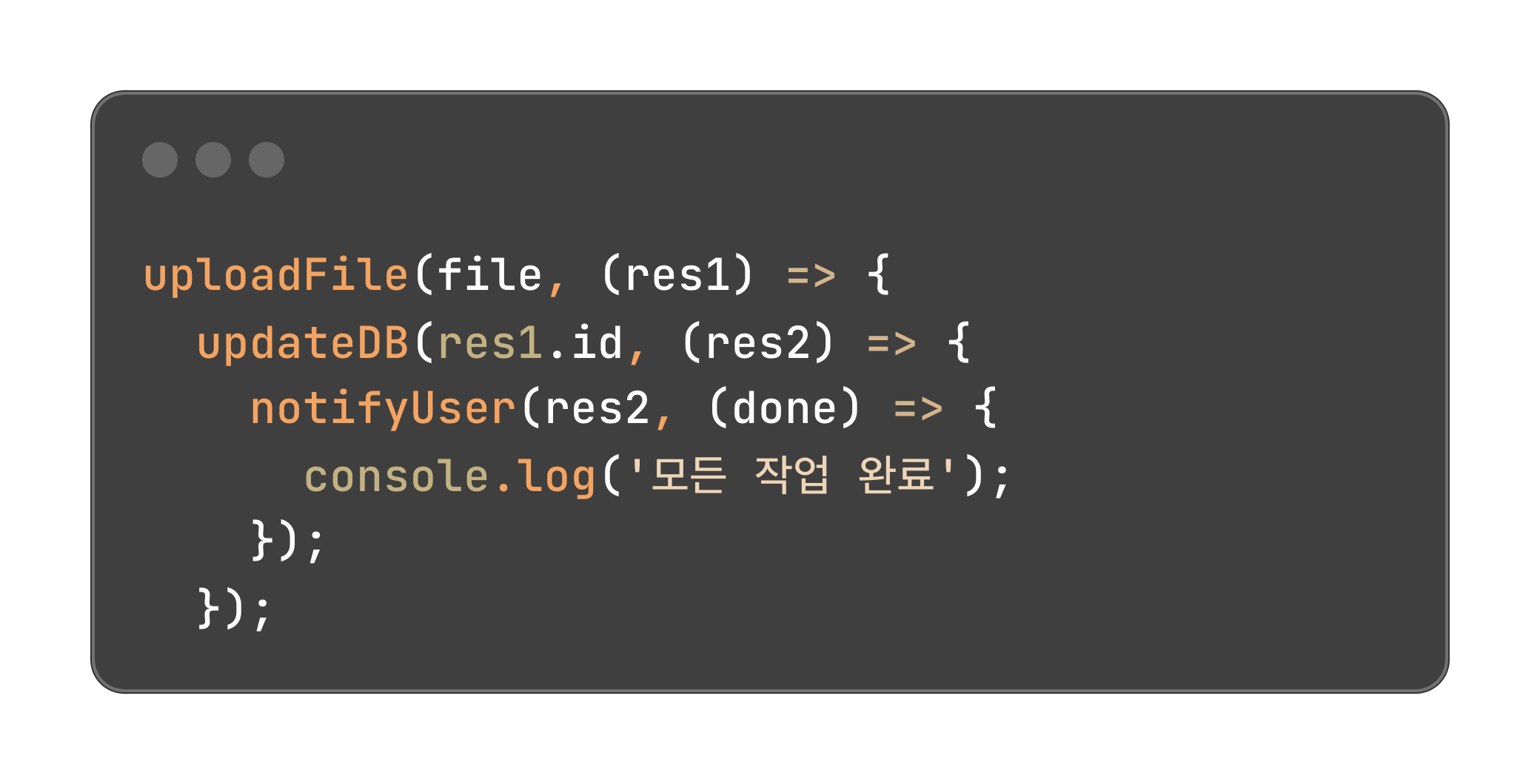 콜백 함수를 중첩해 사용하는 방식은 일정 수준까지는 유용하지만 콜백이 여러 단계로 깊어질수록 코드의 들여쓰기 구조가 복잡해지고 가독성도 급격히 떨어져요.
