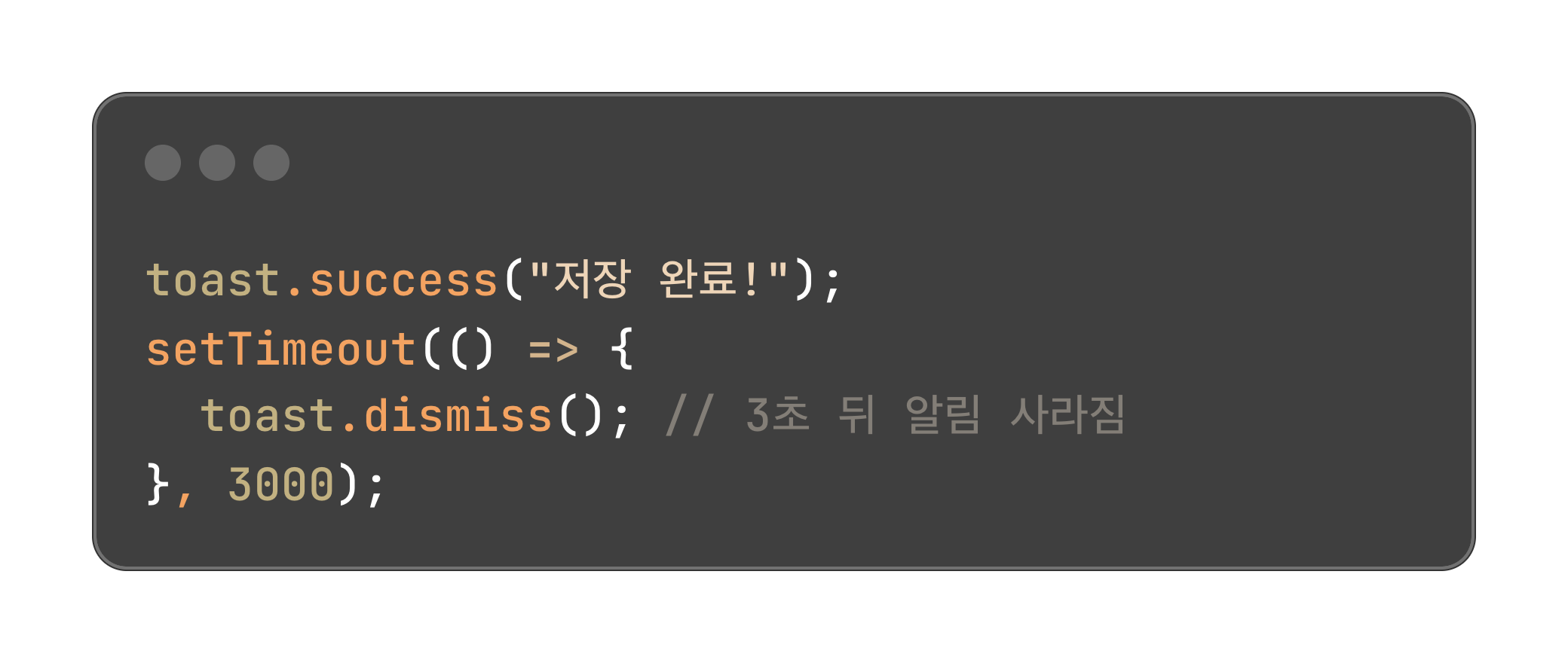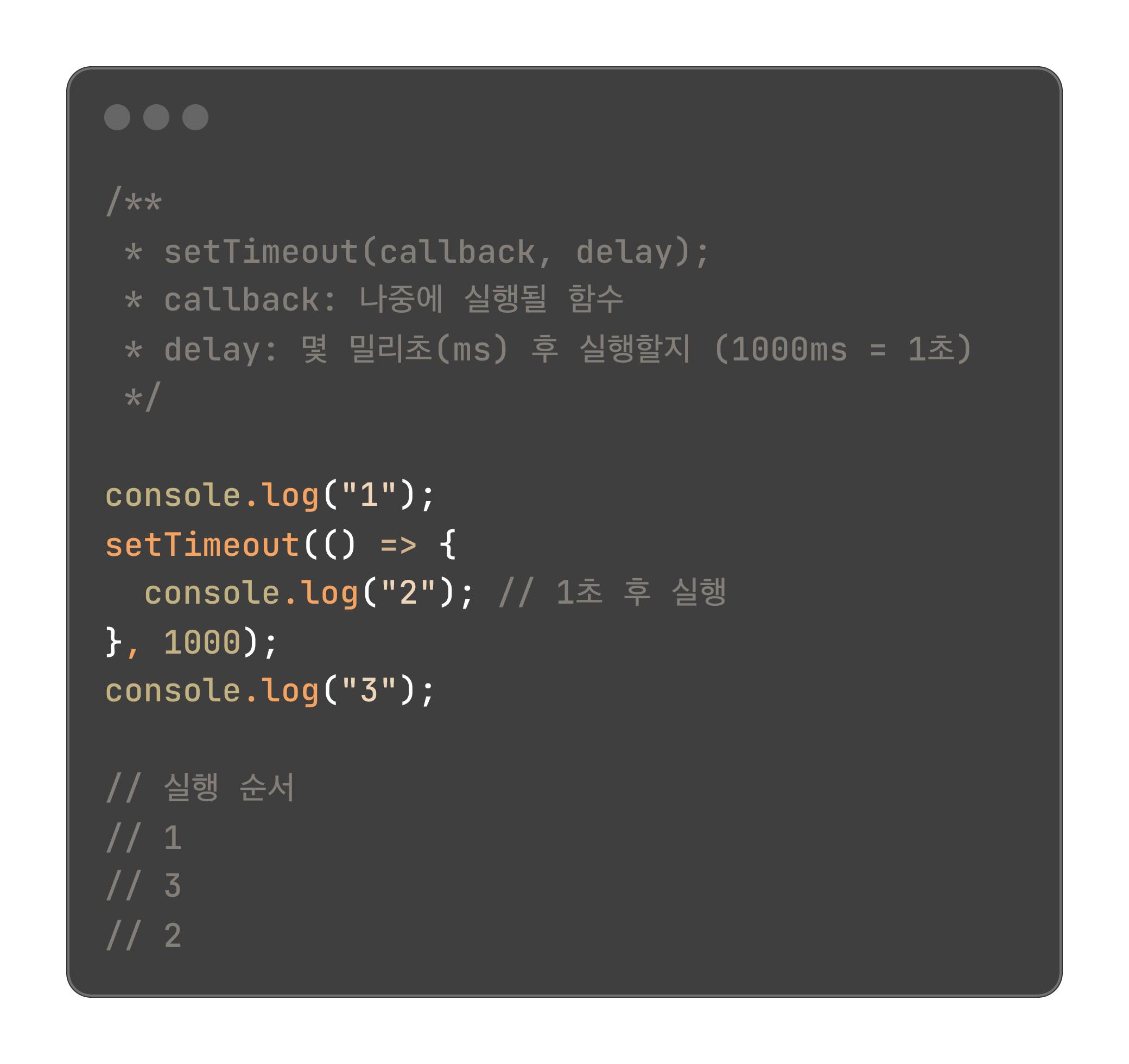 setTimeout은 일정 시간 뒤 실행될 코드를 예약할 수 있어요. 실무에서는 토스트 메시지 자동 닫기, 애니메이션 지연 실행 등에서 자주 사용됩니다.