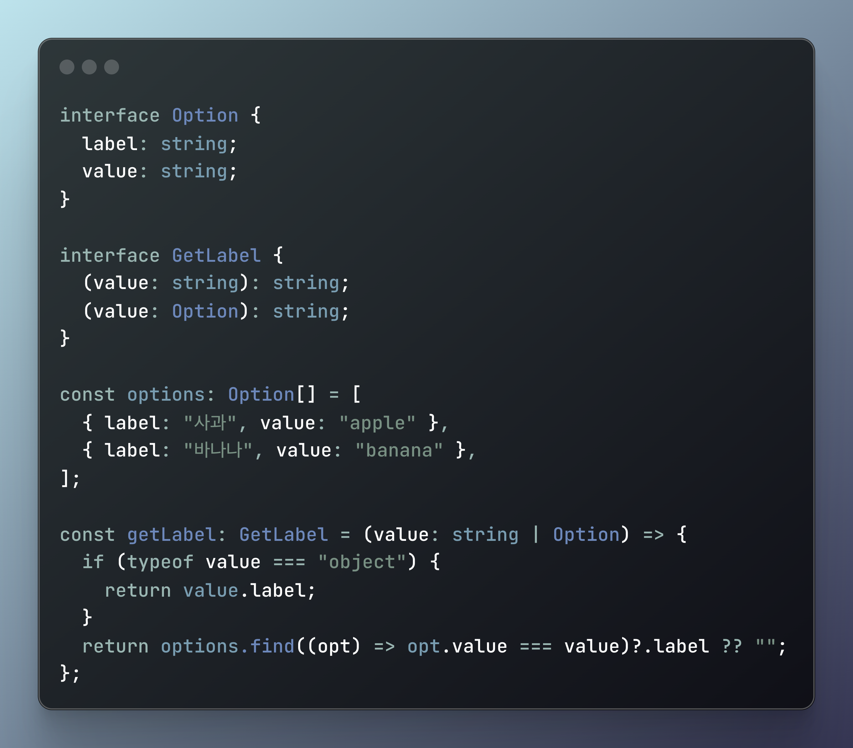 예를 들어 셀렉트 박스나 드롭다운 컴포넌트에서 선택된 값(value)으로부터 해당 옵션의 label을 찾아주는 유틸리티 함수를 작성한다고 가정해 볼 수 있어요.