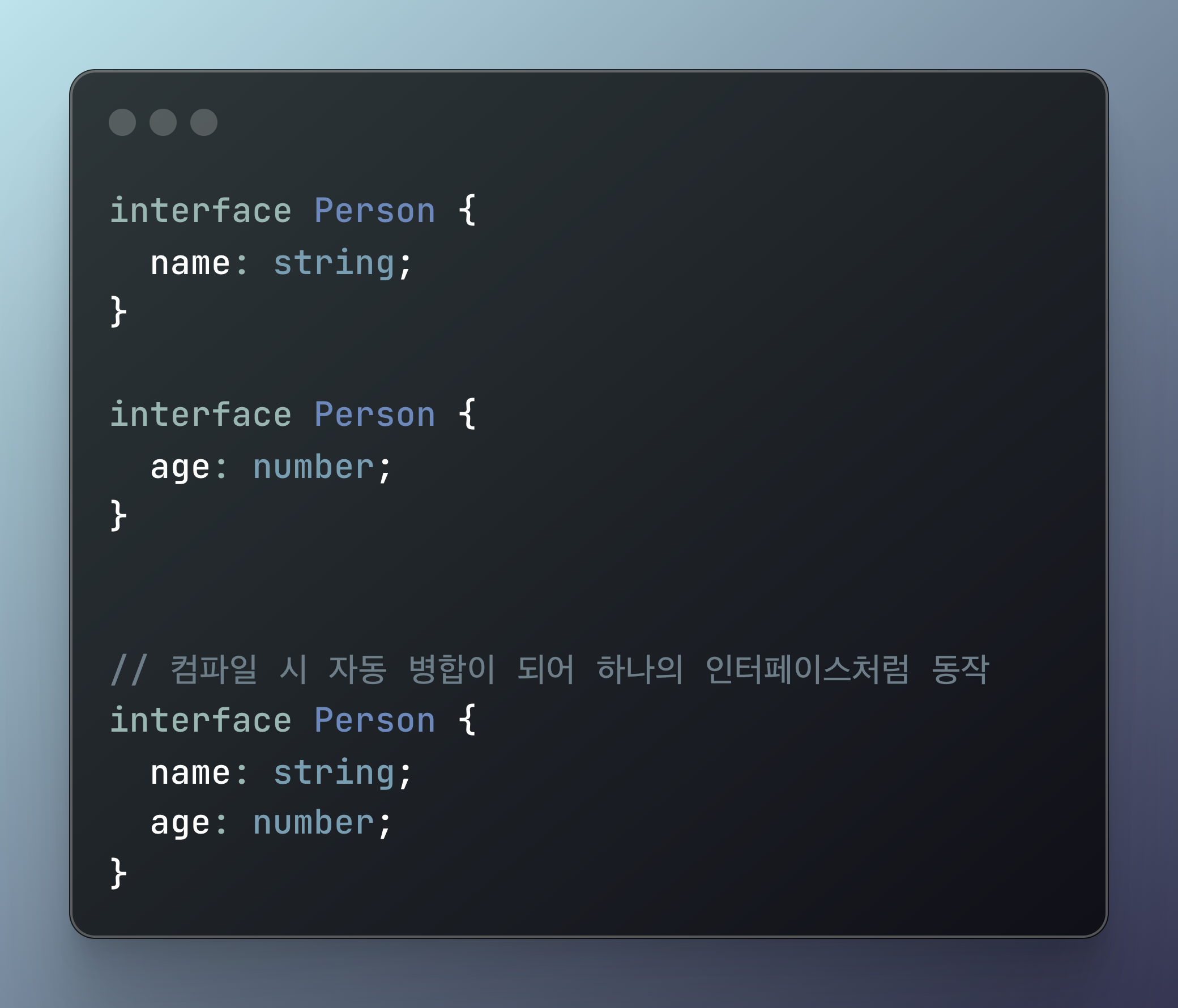 이런 특성 덕분에 interface는 전역 객체 확장이나 외부 라이브러리의 타입 보강에 자주 사용됩니다.
