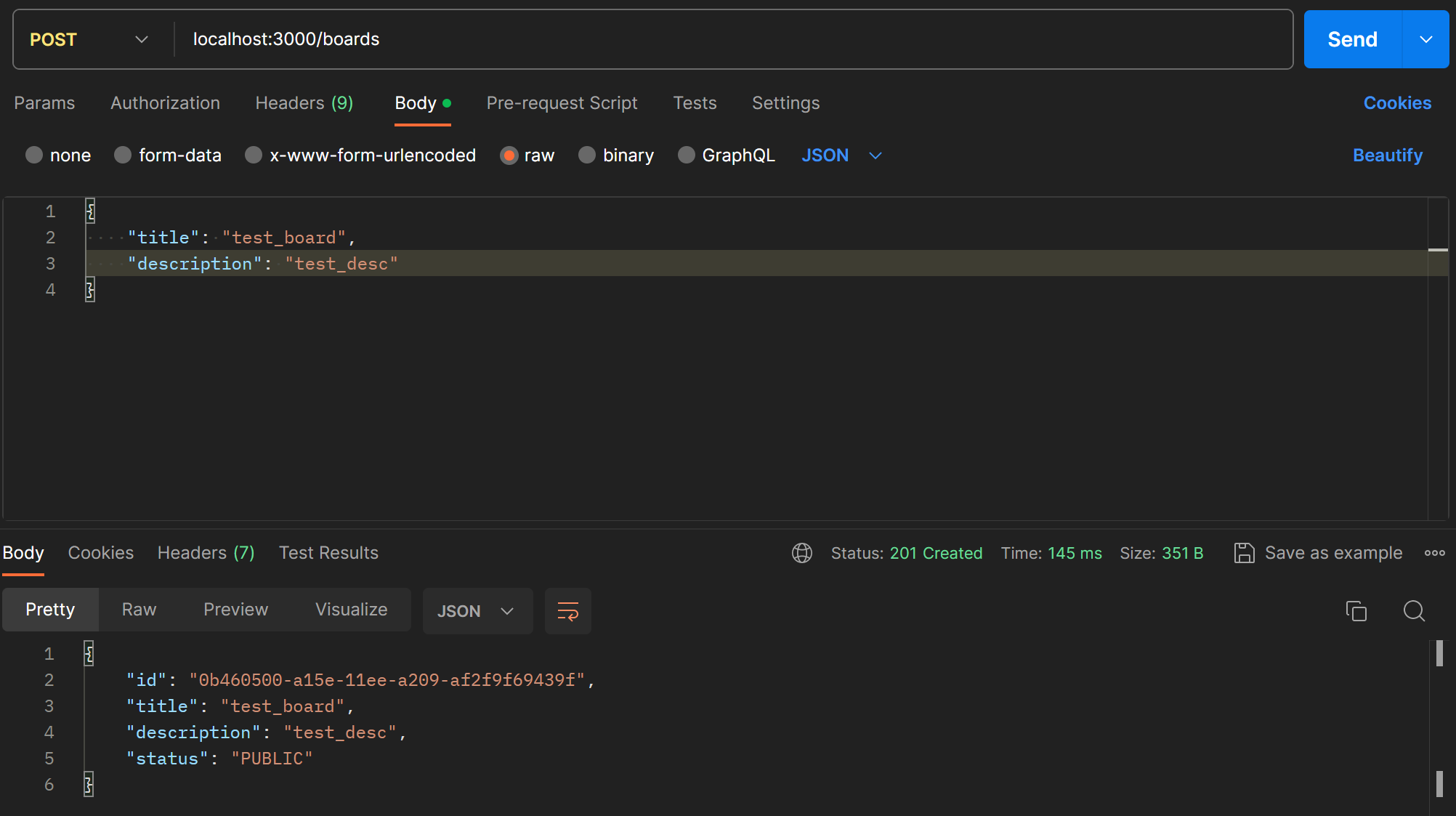 title과 description을 받는 post 요청이다. nest.js에서는 @Body 데코레이터로 요청의 Body 부분을 받아올 수 있다. 위 코드처럼 key값을 인수로 하여 특정 값만 따로 가져오는 것도 가능하다. Body로 넘어온 값들을 서비스의 createBoard 함수에 인자로 넘겨준다.