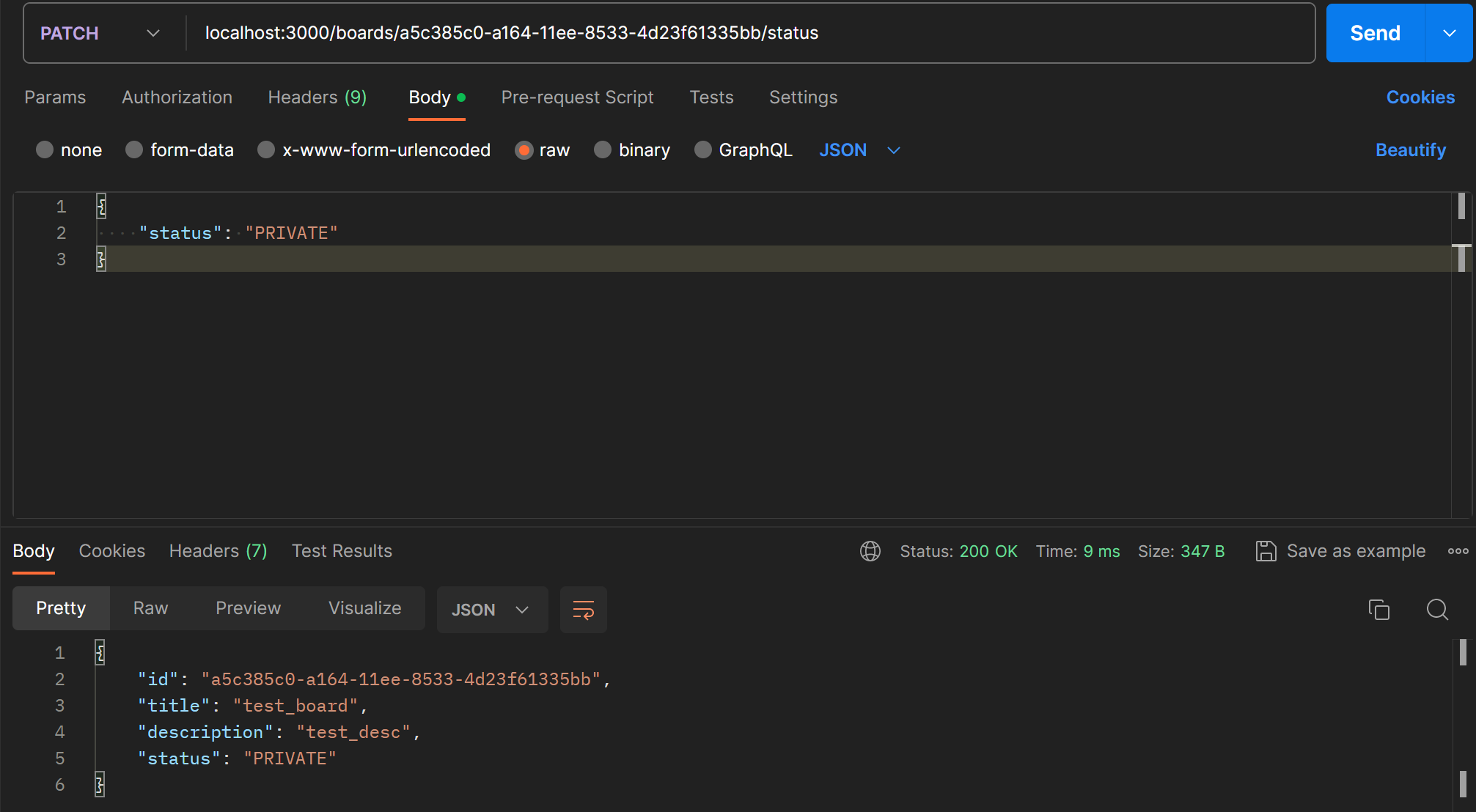 board의 status를 변경하는 API를 만들어보자. 수정할 board의 id와 status를 받아 처리한다.