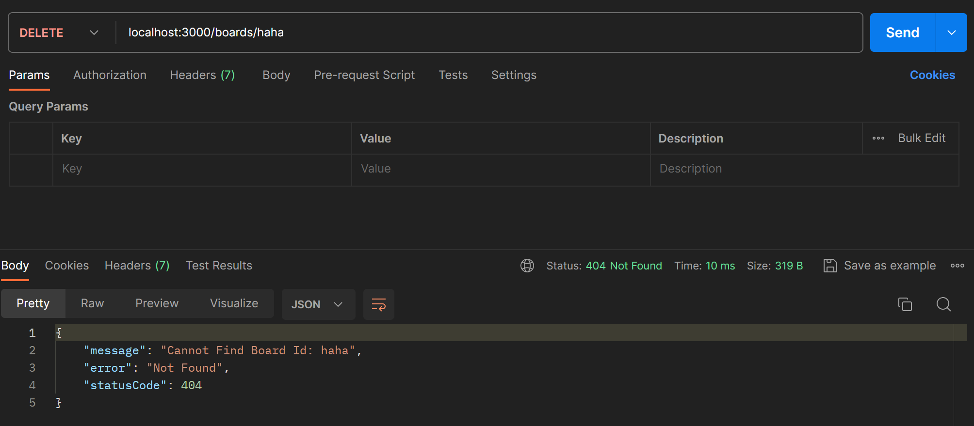수정한 getBoardId 메서드를 이용해서 deleteBoard에서도 해당 id의 보드가 없는 경우 error message를 반환하도록 한다.