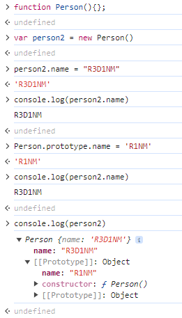 위의 예제에서 person2 인스턴스에는 이미 멤버변수 name이 정의되어 있다. 그러니 Person의 프로토타입에서 name을 따로 정의해도 person2.name을 콘솔에 찍으면 [[Prototype]]을 참조하지 않고 멤버변수에 선언된 값이 찍힌다.