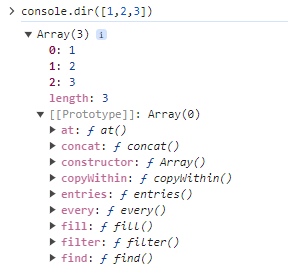 이번엔 배열을 하나 생성하여 구조를 살펴보자. [[Prototype]]이 존재하고 그 내용은 앞서 살펴본 생성자의 prototype 객체와 같다.