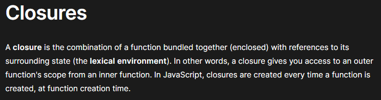Closure는 lexical environment와 함수의 조합이다. 사실 위의 정의만 보아서는 closure가 어떤 개념인지 잘 와닿지 않는다. 어떤 한 컨텍스트 A가 있고 그 안에 내부함수 B가 있다고 가정하자. 여기서 Closure는 A와 B를 모두 포함하는 개념이다. 그렇다면 Closure가 어디서 사용될까? Closure라는 개념은 주로 A의 Lexical environment와 B가 조합할 때 나타나는 특수한 현상을 지칭하기 위하여 사용된다.