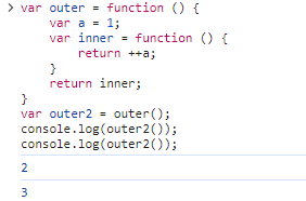 위의 예제가 어떻게 동작되는지 살펴보자. outer 함수 안에는 지역변수 a와 함수 inner가 선언되어 있다. inner는 outer의 지역변수 a의 값을 하나 증가시킨 뒤 return한다. 그리고 outer는 이 inner 함수 자체를 return한다. 전역공간에서 outer2는 outer()의 결과값을 담는다. 즉, outer가 반환한 inner 함수를 받았다. 그리고 이것을 두 번 실행하고 그 값을 살펴보자.