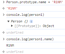 Person의 프로토타입에 name을 선언하여 값을 넣어도 person1에는 변함이 없다. 그러나 person1.name을 콘솔에 찍어보면 프로토타입에 선언한 name 값이 출력된다. 이를 통해 JS가 peron1의 [[Prototype]]을 타고 Person의 프토토타입에 접근하여 name에 담겨있는 값을 읽어냈다는 것을 알 수 있다. 이처럼 생성자의 프로토타입에 직접 접근하면 이 생성자로 생성된 모든 인스턴스가 같은 [[Prototype]]를 참조하기 때문에 같은 값을 넣어주는 효과를 얻을 수 있다.