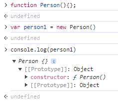 Person이라는 빈 생성자를 선언한 뒤 이것으로 person1이라는 인스턴스를 만들었다. person1을 콘솔에 찍어보면 [[Prototype]]만 있을 뿐 비어 있는 것을 알 수 있다.