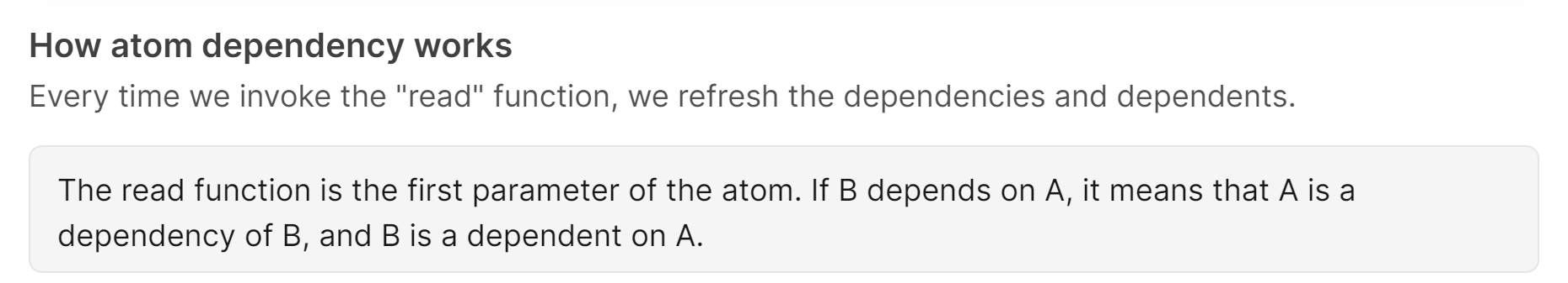 설명에 따르면 read 함수가 호출될 때마다 dependency와 depenedent가 새롭게 구성된다. 무슨 말이냐 하면, atom을 선언하는데 있어서는 dependency 관계가 맺어지지 않고, read 함수가 호출되어 atom이 state로 사용될 때만 관계가 지어진다는 것이다.