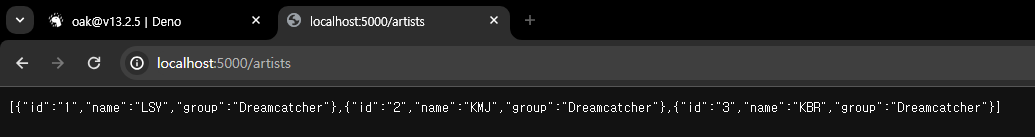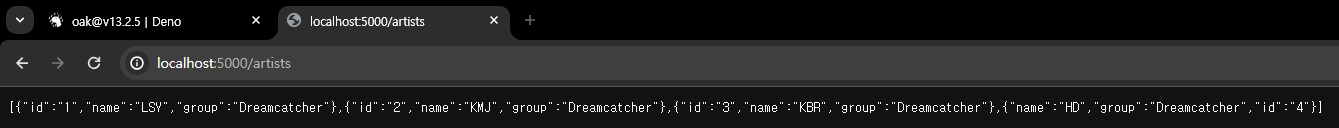 반환이 잘 되었다. 그 상태에서 브라우저로 artists 경로에 접속하면 이제 4번 항목까지보인다.