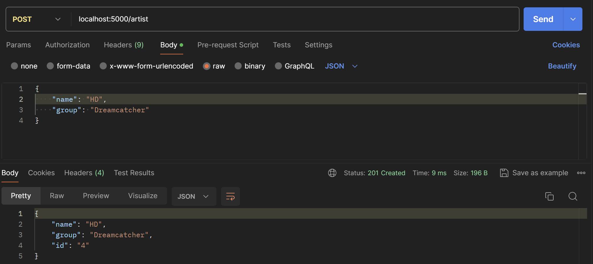 post도 만들어보자. 새로운 artist를 생성한다고 생각한다. request의 body에 생성하려는 artist의 name과 group이 전달될 것이다.
