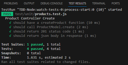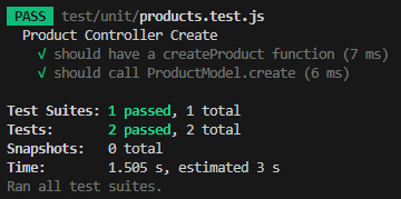 toBeCalledWith matcher를 통해서 productModel의 create 함수가 newProduct를 인자로 호출되는지 확인할 수 있다. 테스트를 모두 통과하려면 컨트롤러가 다음과 같이 작성되어야 한다.