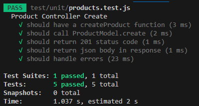 Products 컨트롤러의 creaetProduct 함수를 테스트하기 위한 단위 테스트 케이스 5가지가 완성되었다.