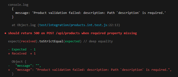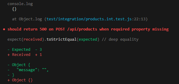 필수값인 description 없이 요청을 보내면 상태코드 500으로 서버 에러를 리턴한다. 에러메시지가 제대로 왔는지 확인하기 위하여 toStrictEqual matcher로 response의 body를 확인해준다. 그런데 막상 어떤 메시지가 오는지 로그를 확인해보면 아무것도 없다.