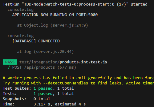 통합테스트는 단위테스트와 다르게 app이 실행되기 때문에 server.js에 달아놓은 log도 함께 찍힌다. Database도 연동된 것이 보인다.