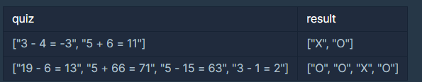 덧셈, 뺄셈 수식들이 'X [연산자] Y = Z' 형태로 들어있는 문자열 배열 quiz가 매개변수로 주어집니다. 수식이 옳다면 "O"를 틀리다면 "X"를 순서대로 담은 배열을 return하도록 solution 함수를 완성해주세요.