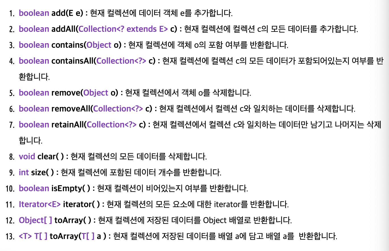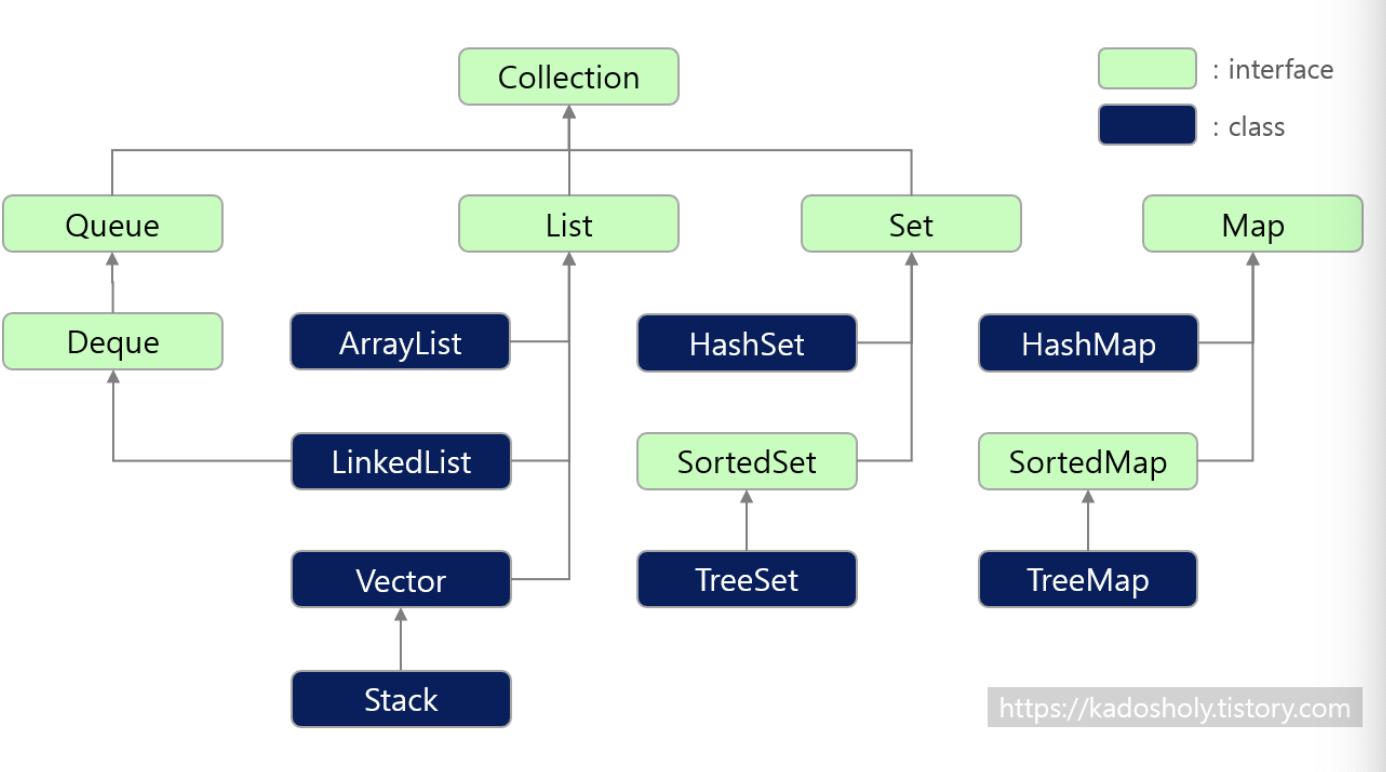 컬렉션과 관련된 인터페이스 또는 클래스가 정의되어 있는 코드를 살펴보면 아래와 같이 제네릭(generics) 형태로 구현되어 있는 것을 확인할 수 있습니다. 따라서 사용자는 사용하고자 하는 데이터 타입을 지정하여 사용할 수 있습니다.
