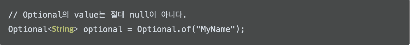 Optional 타입의 변수의 값은 절대 null 이어서는 안 되며, 항상 Optional 인스턴스를 가리켜야 한다.