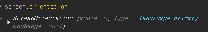 screen.width : 이는 모니터의 너비를 반환한다screen.height : 모니터의 높이를 반환한다screen.availHeight : indicator를 제외한 높이를 반환한다screen.availWidth : indicator를 제외한 너비를 반환한다screen.orientation : 가로의 값이 큰지 세로의 값이 큰지 비교하고 가로가 크다면 landscape를 포함한 객체를 세로가 크다면 portrait을 포함한 객체를 반환한다현재 값이 아닌 모니터의 크기에 따라 달라진다